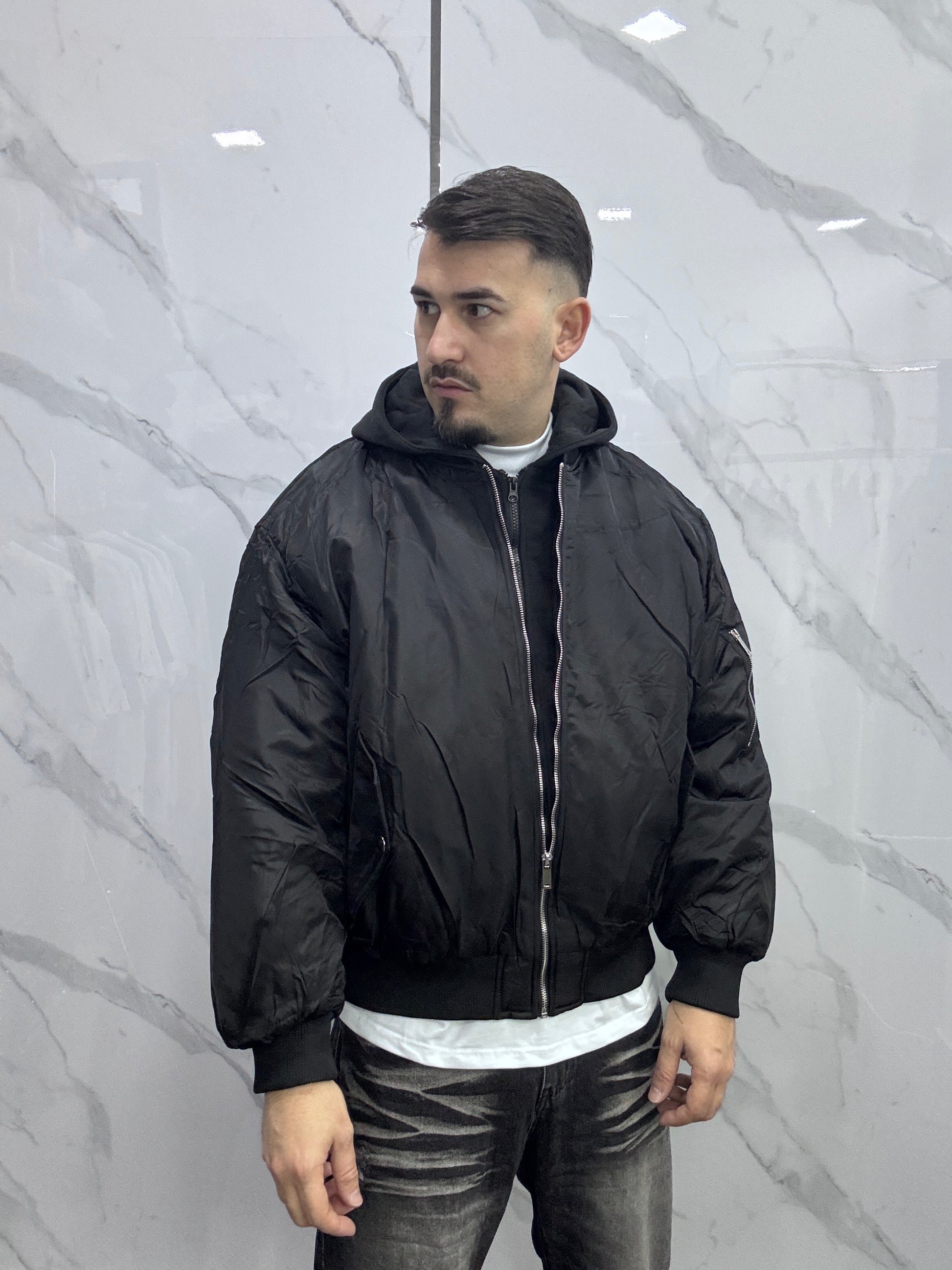 Bomber con doppia abbottonatura. Finta felpa con cappuccio rimovibile