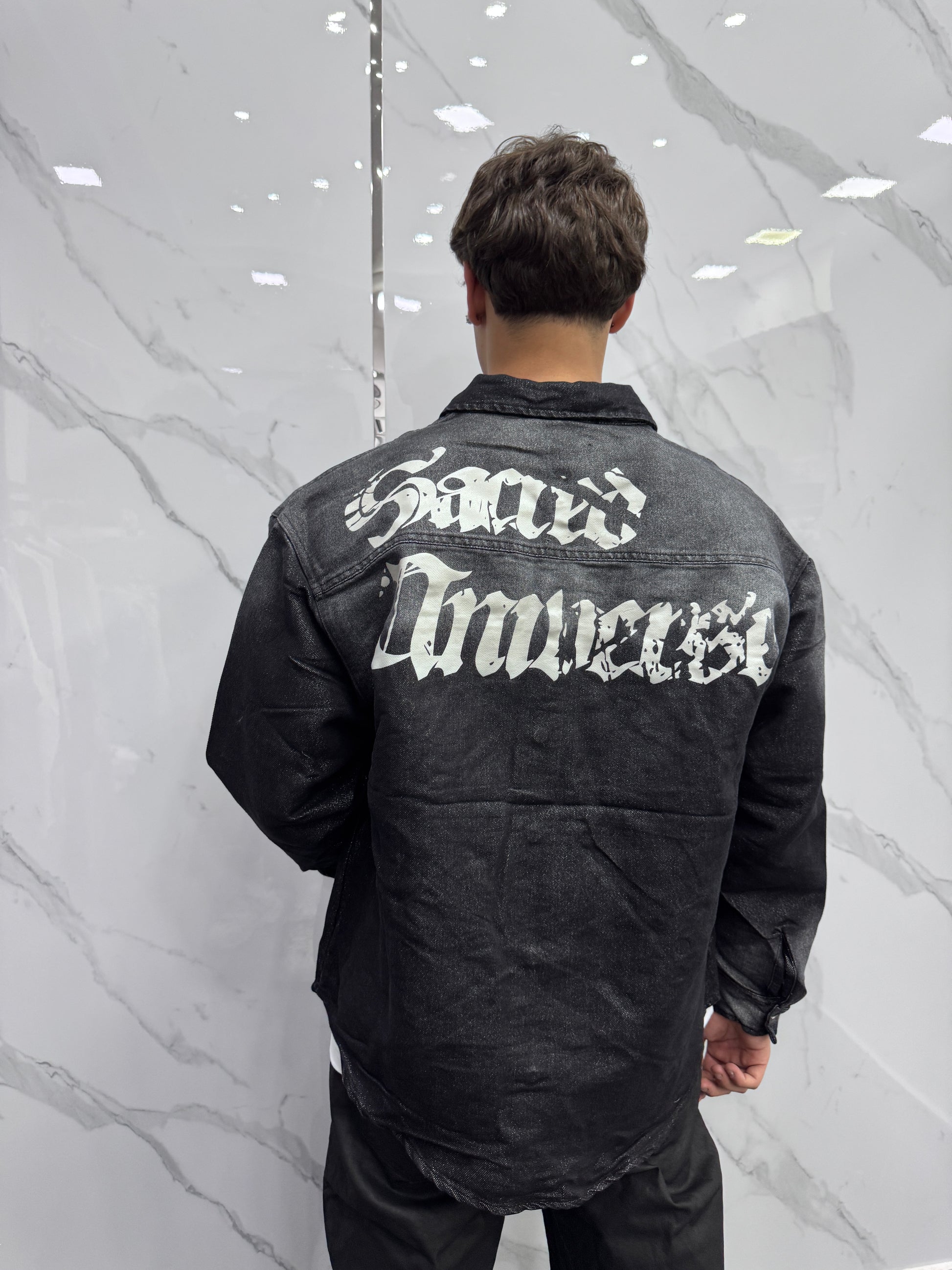Camicia in jeans laminata con stampa sul retro