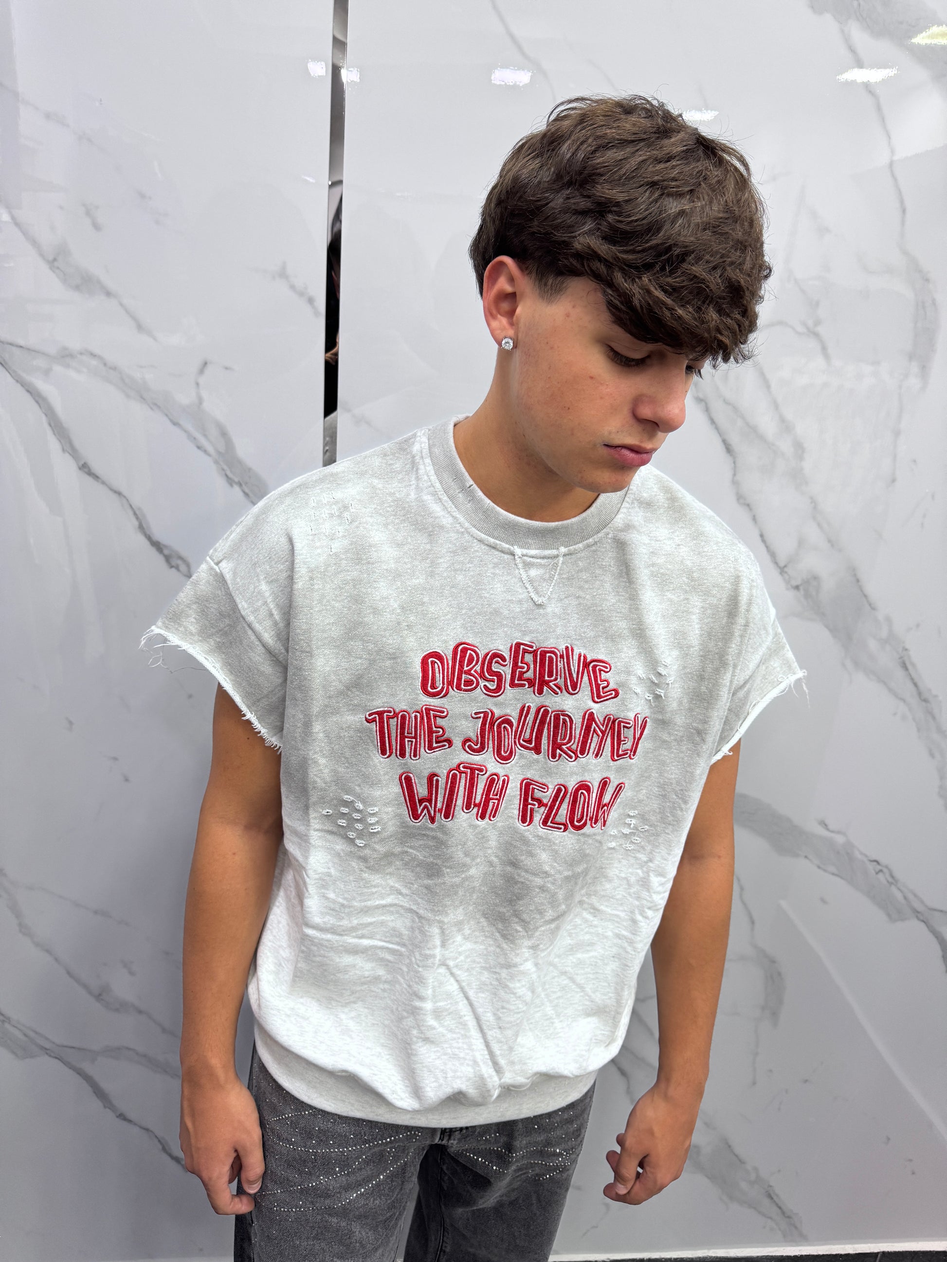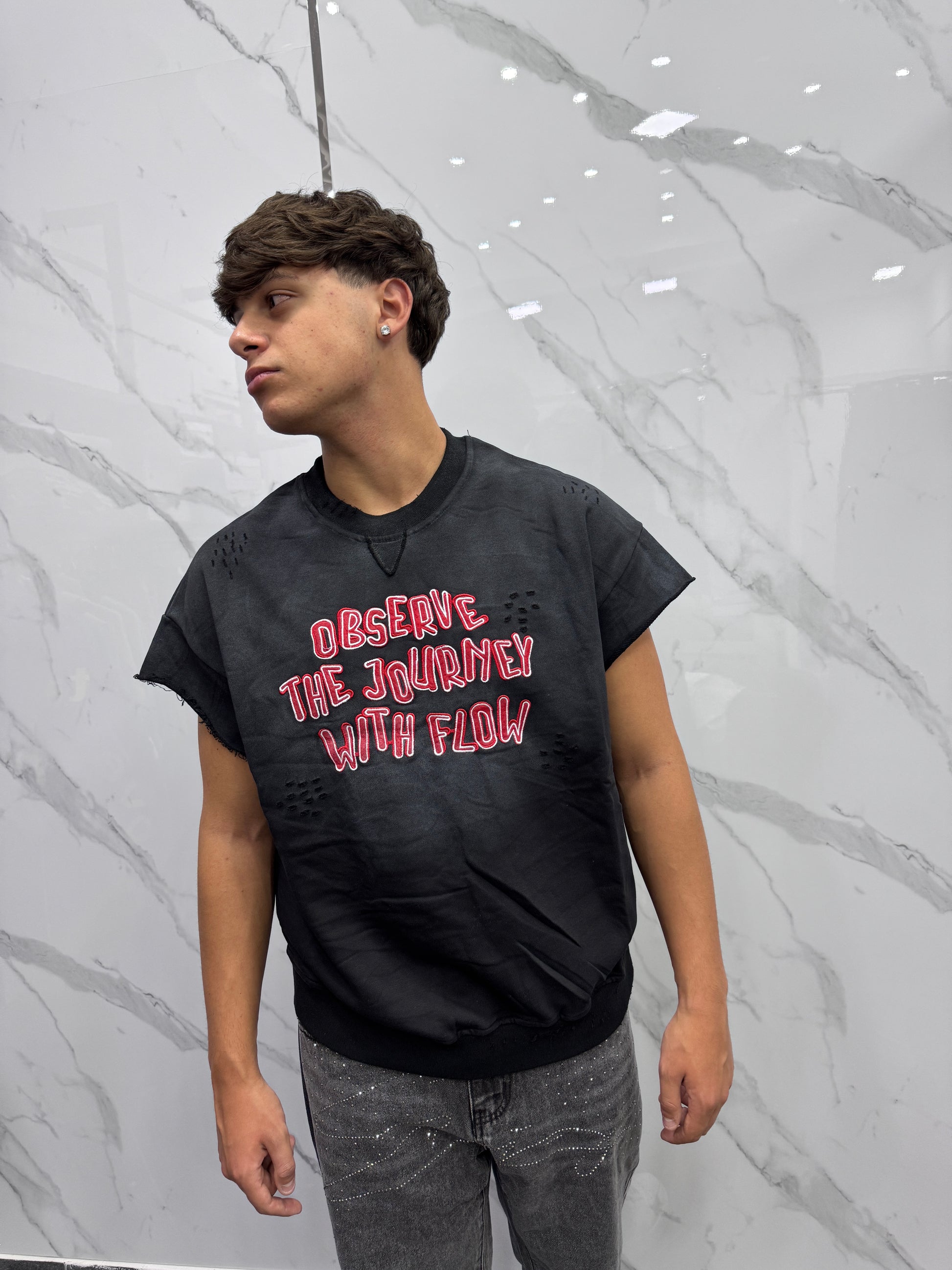 Felpa smanciata taglio vivo tessuto slavato con scritta ricamata e micro rotture